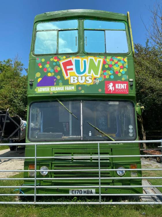 A double decker Bus converted into a soft play centre with racing slides, ball pit, soft assault course, music and party lights.